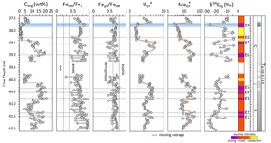Thus, sedimentary enrichments in U and (possibly) Mo, coupled with elevated FeHR/FeT ratios (≥0.38), are highly indicative of deposition beneath an anoxic water column. Euxinia is indicated by a high accumulation of Mo, coupled with high Fepy/FeHR ratios (in the range of 0.6–0.8 or above, for samples with FeHR/FeT ≥0.38). Enrichments in U coupled with low Mo and low Fepy/FeHR ratios (≤0.6, for samples with FeHR/FeT ≥0.38), indicate either ferruginous conditions or possibly weak euxinia, with moderately elevated Mo concentrations indicating moderate euxinia.