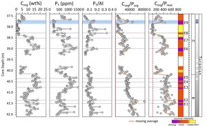 There is, however, a suggestion of an overall progressive decrease (and more variability) in P recycling in the upper half of the section, including intervals where Corg/Preac ratios are close to the Redfield Ratio (fig. 5). Sedimentation rate may impact the extent of P recycling, and it is noticeable that the particularly low Corg/Preac ratios that occur from 38.37–37.87 m coincide with an interval of very high carbonate content, potentially reflecting more rapid sedimentation and hence more efficient trapping of P in the sediment. However, the progressive decrease in Corg/Preac ratios that occurs across the three intervals of particularly high carbonate deposition identified above, supports a general decrease in the intensity of P recycling through the recovery phase. This is again consistent with the proposed decrease in both the production of sulfide and the preferential release of P from OM. It is also noticeable that there are peaks in P within the upper carbonate-rich interval (indicated by elevated PT/Al ratios at ~38.27 m and ~38.09 m) that do not coincide with elevated Corg, suggesting particularly enhanced sequestration of P in the sediment (fig. 5). Thus, while P recycling was a pervasive feature throughout most of OAE2 (Beil et al., 2020; Kraal et al., 2010; Mort et al., 2007, 2008; Poulton et al., 2015), including during much of the recovery phase, the overall decrease in recycling towards the end of the recovery phase likely points to a driving mechanism for the termination of water column anoxia through decreased P availability.