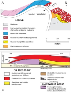 The Fig Tree section on the southeast limb of the Paulus Syncline is well exposed along and adjacent to R40. From base to top it can be split into five subdivisions (fig. 9): (1) a basal unit of mudstone of which only the uppermost 100–150 m is exposed; (2) a 100± m thick section of mudstone with a prominent lenticular unit 10–15 m thick of conglomerate at the base, interbedded thin-bedded sandstone and mudstone in the middle and a prominent channel-fill conglomerate at the top (fig. 11A); (3) 30 m of quartzose sandstone (fig. 11A); (4) a section 150+ m thick, dominated by iron-rich units including BIF and chamositic sandstones, shale, and lenticular beds of chert-clast conglomerate and sandstone up to about 30 m thick (fig. 11A), and (5) an upper section at least 50 m thick of mudstone. Along the R40, the basal mudstone is in contact on the southeast with a thick tectonic breccia composed of black chert blocks in a matrix of sheared, altered komatiitic volcanic rock (figs. 3 and 4). The stratigraphic base of the mudstone is not exposed along the R40 but about a kilometer to the southwest the mudstone overlies black and banded chert at the top of the Mendon Formation.