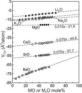 where ‘d’ is equilibrium M-O bond distance, which is the sum of the ionic radii of the modifier cation and O2- derived from crystalline silicates (Huheey et al., 1993; Navrotsky et al., 1985). The constant (6.83 Å3/atom) is an ‘excluded volume’ common to all alkali and alkaline earths modifier cations. The VPoly term is independent of melt composition and is 37.41, 61.19, 92.06 and 115.46 Å3/atom respectively for Li, Na, K and Ba. Following Nesbitt et al. (2022), VCol values for the Li, Na, K and Ba silicate melts were calculated using equation (11) by subtracting the appropriate VPoly from of tables 2–5. VCol values for Mg, Ca, and Sr melts were similarly calculated after evaluating at 1673 K using the expansivities of Tomlinson et al. (1958). All VCol values are plotted on figure 6. In each system, VCol increases effectively linearly with increasing modifier oxide content: