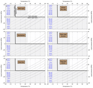 Equation (26) assumes temperature-independence of the terms of the equation. The analytical expression is therefore only valid when conditions {Th∞, Patm} and {Tf, Pf} are close. We find that the difference between the numerical and analytical value of ΔTP increases with water depth and virtually vanishes (~0.1%) for infinitely shallow waterbodies. On average for the brines listed in table 3 and for a Th∞ = 25 °C the difference is smaller than 0.1 °C for waterbodies shallower than 320 meters, with however a difference up to 0.5 °C for Paleo-Lake Gosiute. For deeper waterbodies and/or concentrations exceeding 0.5 mol kgH2O-1 of SO42- or HCO3-, the use of the numerical expression is recommended.