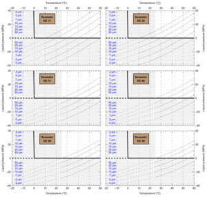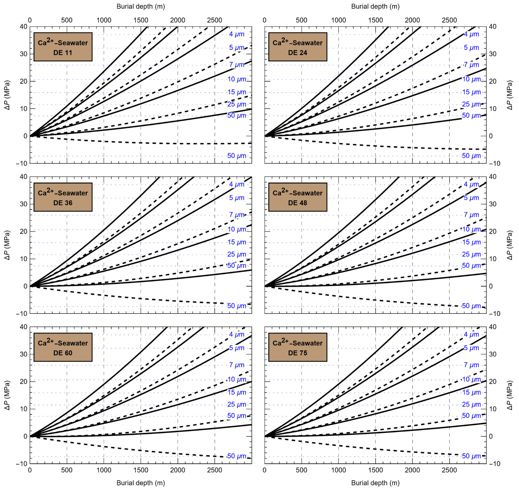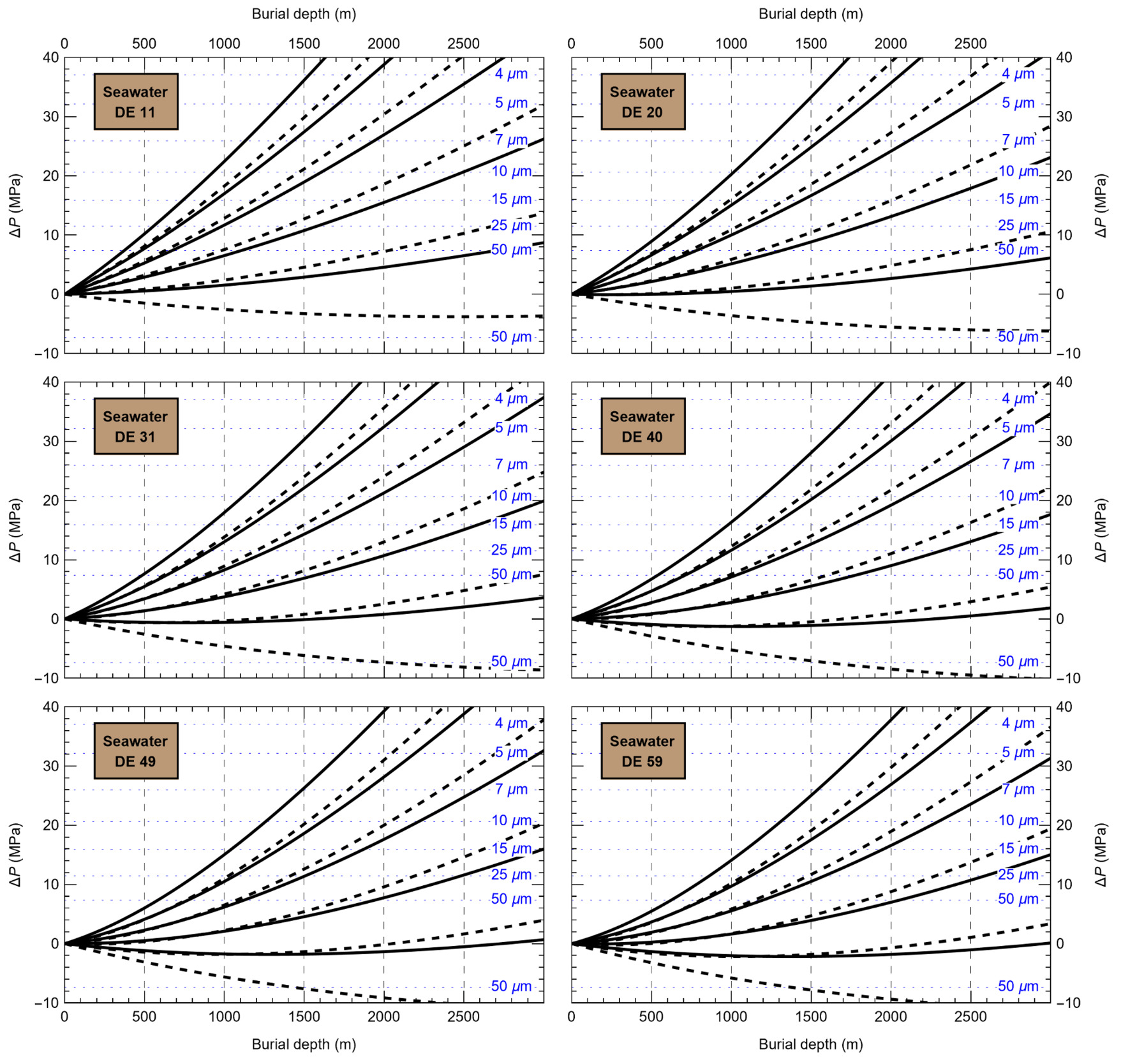 iso-Th∞ curves for several Th∞ (fig. A1); and curves of ΔP as a function of burial depth for several geothermal and pressure gradients (fig. A2). These two types of curves are plotted along with ΔPlim for different FI sizes and can be used to determine the maximum size of unaltered FI.