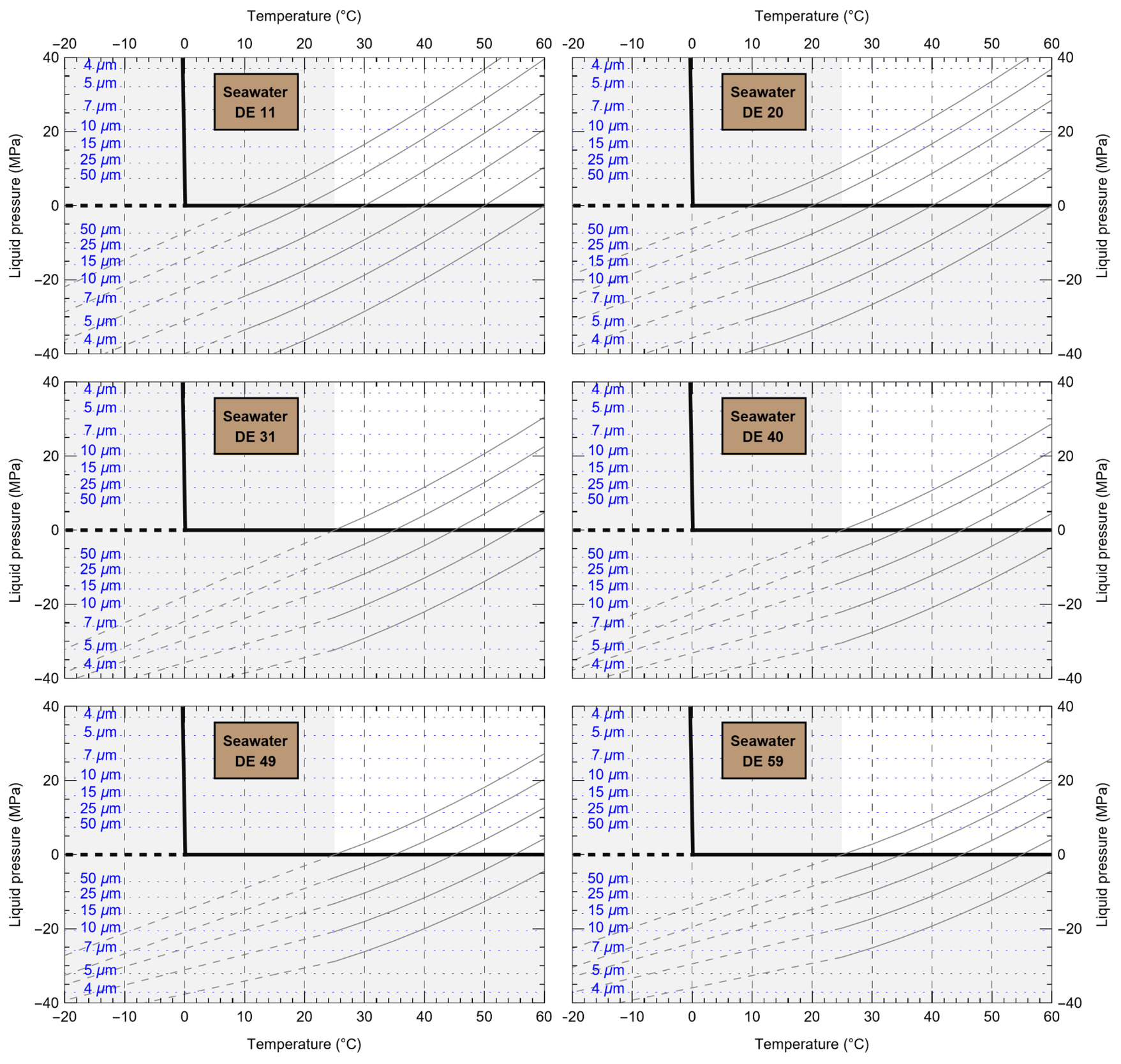 Temperature extrapolation: The scarcity of empirical volumetric data of hypersaline brines below 25 °C (see SI) prevents direct testing of the natural extrapolation of the Al Ghafri EoS below 25 °C. Whereas pure water exhibits a density maximum, concentrated brines do not have this feature. Nevertheless, the slope of the density versus temperature becomes less negative at low temperature. Therefore, to estimate the reliability of the natural temperature extrapolation of the EoS below 25 °C, we compared the coefficient of thermal expansion of the brine (α) as calculated by linear versus natural extrapolation of the Al Ghafri EoS for the brine compositions listed in table 3. From 25 to 10 °C, deviations between the two extrapolations were below 5% for all brines, except for those with [SO42-] or [HCO3-] > 0.5 mol kgH2O-1. We thus recommend natural extrapolation down to 10 °C. For sulfate or alkaline brines with [SO42-] or [HCO3-] > 0.5 mol kgH2O-1, however, we do not recommend natural extrapolation at all. If one needs to correct for the effect of the Laplace or hydrostatic pressure below the extrapolation limit (10 or 25 °C depending on composition), we recommend the use of ΔTP and ΔTL at this extrapolation limit. If one needs to estimate PL below the extrapolation limit, we recommend using linear extrapolation of the iso-Th∞ curve (as illustrated in Section 4.3).