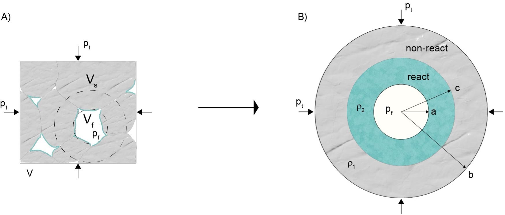 We consider a representative elementary volume (REV) of a porous matrix, fully saturated with a single, reactive fluid. Chemical alteration is assumed to be driven by a fluid phase that is out of equilibrium with the surrounding solid, initiating a reaction at the fluid-solid interface and progressing into the solid matrix (fig. 1A). The model assumes isothermal conditions and does not account for thermal stress. We acknowledge that the reactive surface area and mineral distribution are critical in natural settings; however, our model simplifies these complexities by assuming a uniform reactive interface. This simplification allows us to focus on the coupled evolution of porosity, reaction, and mechanical deformation, and should be viewed as a first-order approximation of more complex, heterogeneous systems.