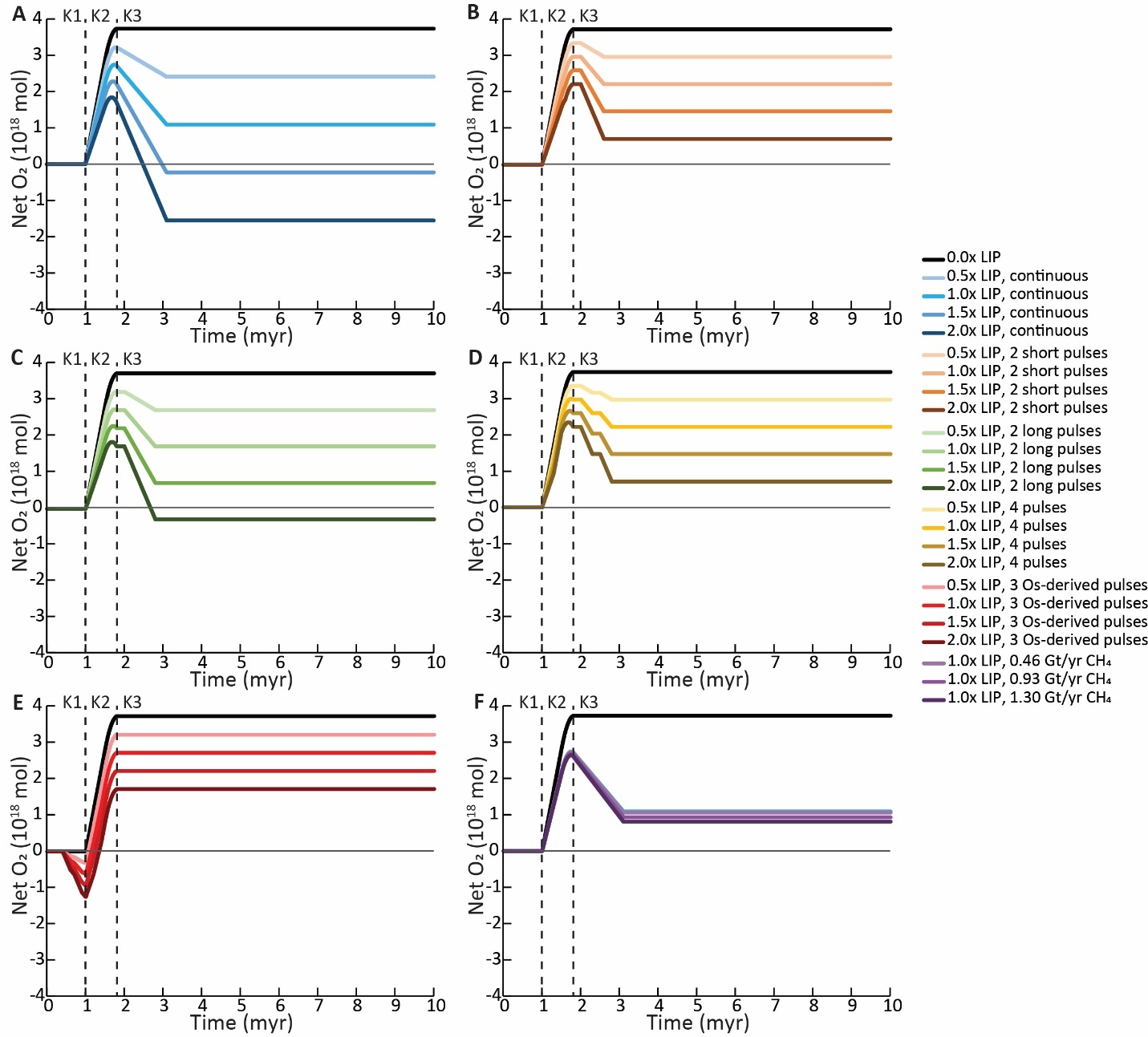 Various models for the reductant emission loads from HALIP during OAE-2 were analyzed to determine the O2 production, consumption, and net change (fig. 2, supplemental table 4). These covered a range of sizes, durations, and eruptive styles of the LIP (Kasbohm et al., 2021; Maher, 2001; Sinton & Duncan, 1997). Both continuous and pulsed intervals of volcanic activity were modeled (fig. 2A–D). Alternatively, osmium concentration and isotope indicators of volcanic activity around OAE-2 (Y.-X. Li et al., 2022; Sullivan et al., 2020) may represent pulses of LIP activity and this was also modeled (fig. 2E). A range of reducing material fluxes was considered for the LIP reductants compared to modern mid-oceanic ridge hydrothermal output (supplemental table 1). The abundance of thermogenic CH4 was also modulated to determine the degree of impact this might have on the O2 budget (fig. 2F), with minor effect (<0.25 × 1018 moles of O2). Overall, the resulting models covered a broad range of net O2 change across OAE-2, from -1.55 × 1018 moles of O2 (net consumption) to 3.22 × 1018 moles of O2 produced (table 4, fig. 2, supplemental table 4).