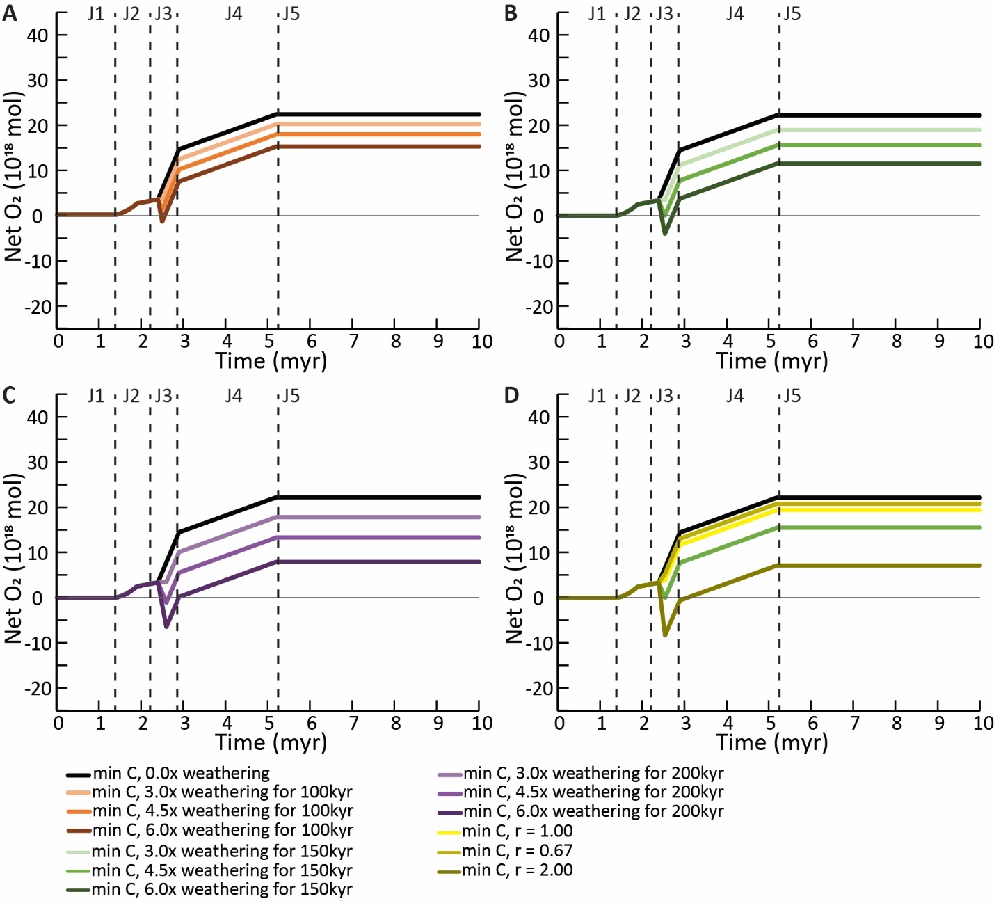 For the T-OAE, various sensitivity tests were employed to examine the average LIP activity and oxidative weathering rate over different organic carbon burial regimes (supplemental table 5). This results in heavy, though not always complete, utilization of O2 across all scenarios, with a net O2 consumption and production between -18.46 and 17.12 × 1018 moles of O2 (table 4, fig. 6B, supplemental table 5).