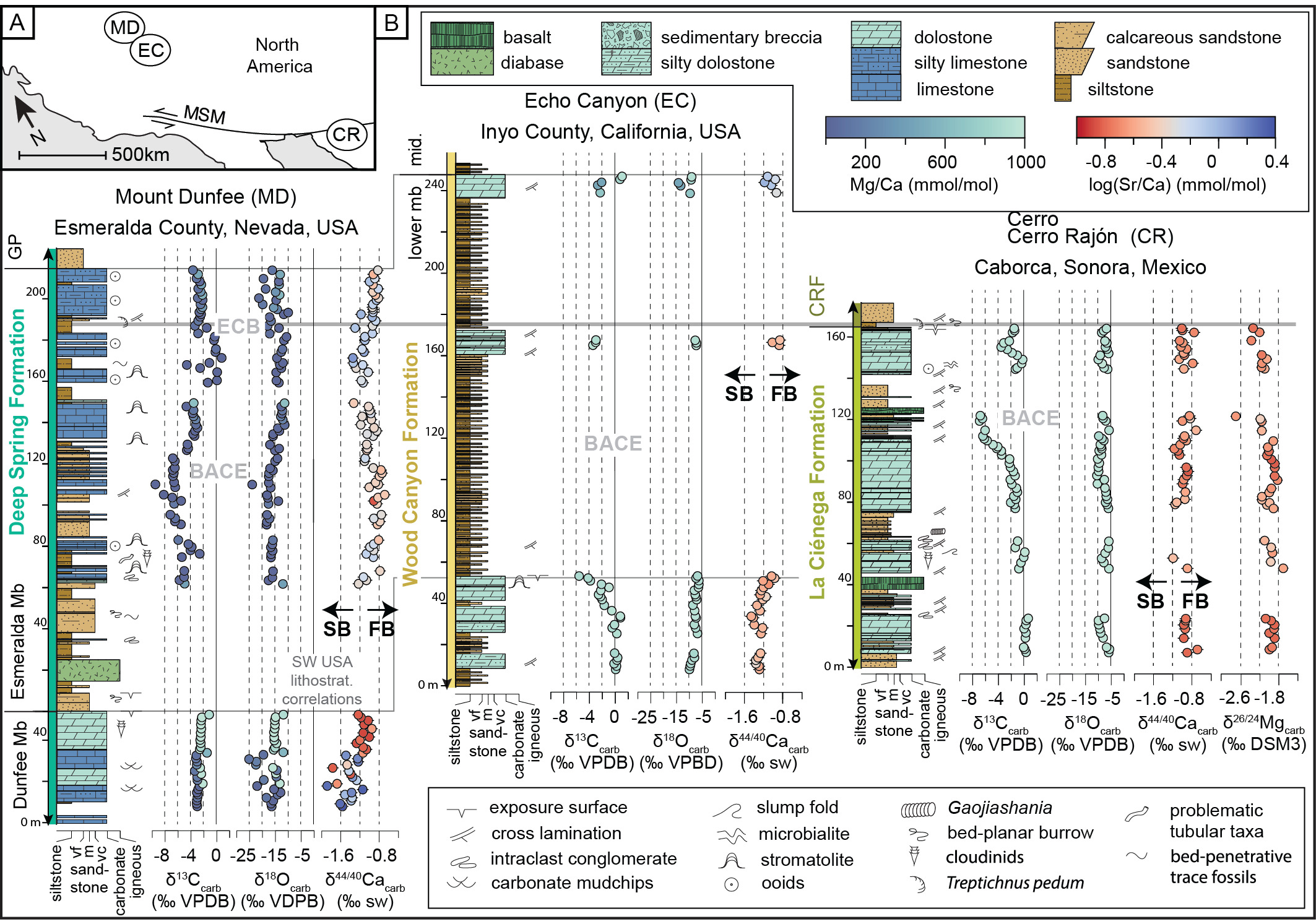 Samples were collected from three sites within the southwestern Great Basin (fig. 1A): Mount Dunfee, Nevada, USA (37.34162°, −117.31937°); Echo Canyon, California, USA (36.51906°, −116.66620°); and Cerro Rajón, Sonora, Mexico (30.41727°, −111.94530°). New geochemical data, including carbonate calcium isotope (‰, n=173) and magnesium isotope (‰, n=42) compositions and Mg/Ca (mmol/mol), Sr/Ca (mmol/mol), Mn/Ca (μmol/mol), U/Ca (μmol/mol) major and trace elemental ratios (n=186), are paired with previously published sedimentological observations, δ13C values, and δ18O values from the top 45 m of the Dunfee Member of the Deep Spring Formation and the entirety of the Esmeralda Member of the Deep Spring Formation at Mount Dunfee (Smith et al., 2016), the lower member of the Wood Canyon Formation at Echo Canyon (Smith et al., 2023), and the La Ciénega Formation at Cerro Rajón (Hodgin et al., 2021). All geochemical data were generated from the same carbonate powders, originally produced by Hodgin et al. (2021), Smith et al. (2016), and Smith et al. (2023) by micro-drilling cut carbonate samples, with care taken to avoid veins, fractures, and siliciclastic-rich laminae.