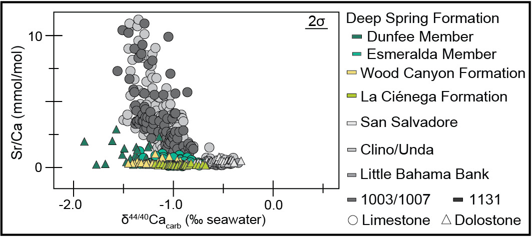 The δ44/40Ca values presented here fall within the range of values predicted for either (1) a local change in conditions that control the dominant mineralogy of a platform during initial carbonate precipitation or (2) a transition between fluid-buffered and sediment-buffered conditions (with respect to calcium) during diagenesis (Ahm et al., 2018; Gussone et al., 2005). The relationship between Sr/Ca ratios and δ44/40Ca values observed from limestones from the Deep Spring Formation is consistent with either scenario (fig. 2B).