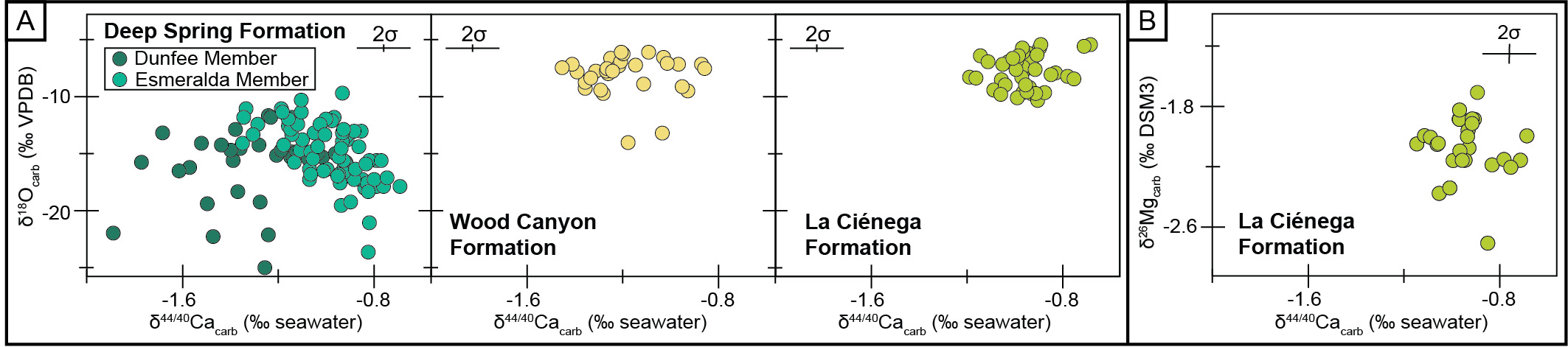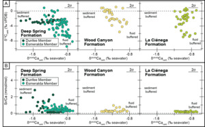 The δ44/40Ca values, δ18O values, and interpreted dolomitization histories of the La Ciénega and lower Wood Canyon formations are consistent with these sites recording seawater values during very early diagenesis. The δ18O values in the Deep Spring Formation are significantly lower than those at the other two sites (figs. 1B and 4A). These low δ18O values of the Deep Spring Formation could either indicate the resetting of the δ18O record with meteoric fluids (plausible for the Dunfee Member which is beneath an exposure surface) and/or at high temperatures. The likely potential for burial diagenesis to reset δ18O values but preserve δ44/40Ca values in limestones has been suggested from modern and ancient environments, assuming sediment-buffered conditions with respect to calcium and carbon during carbonate burial (Ahm et al., 2018, 2021). Thus, for the Esmeralda Member of the Deep Spring Formation, we interpret a scenario in which limestones underwent partial diagenetic stabilization during early marine diagenesis. Final diagenetic stabilization occurred during burial, at which time closed-system conditions with respect to calcium and carbon prevailed. For the Dunfee Member of the Deep Spring Formation – which shows sedimentological evidence for exposure – we suggest that the lower δ18O values could have resulted from meteoric fluids and/or burial diagenesis. This model is consistent with δ238U isotope data from the upper Dunfee Member, which covary with δ44/40Ca data (Chanchai et al., 2026).