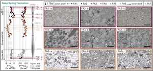 Of the three sections studied, the stratigraphic section of the Deep Spring Formation is the thickest and best texturally preserved. As such, it records the greatest diversity in carbonate facies. In the field, no macroscopic evidence of authigenic carbonate precipitation (e.g., calcite nodules, infilled void spaces) was observed. Seven carbonate facies associations were defined within this unit and paired with δ44/40Ca and δ13C data (FA1-FA7, table 1; fig. 5). FA1 and FA2 are interpreted to record outer shelf sedimentation just below and at fair-weather wave base, respectively. These facies are differentiated by the abundance of siltstone partings in FA1 and the preservation of low-angle cross-lamination in wackestones from FA2. FA3 consists of oolites, interpreted to record high-energy ooid shoals positioned on the outer to mid-shelf. Together, FA1, FA2, and FA3 comprise much of the Esmeralda Member. FA4 consists of stromatolites and limestone wackestone-grainstones, interpreted to record carbonate deposition in shelf environments shielded from high-energy conditions. The shallowest carbonate facies preserved in the Esmeralda Member are assigned to FA5, which consists of sandy limestone grainstone lenses among fine quartz-rich sandstones. FA5 is interpreted to record inner shelf sedimentation. Strata with FA5 facies assignment record the highest δ44/40Ca and lowest δ13C values (fig. 5). Strata belonging to FA6 and FA7 are reported only from the Dunfee Member. FA6 is defined by lime mudstone deposits with an abundance of micritic chip horizons, from which an inner shelf depositional environment is interpreted, while FA7 consists of fabric-destructive dolostones associated with a karstic dissolution surface, observed at the top of the Dunfee Member (fig. 1B).