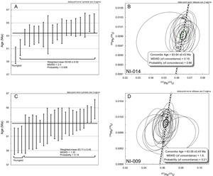 Twenty-four zircon crystals were analyzed from sample NI-009 (table S3). The zircons range in length from ~75 µm to ~150 µm and have euhedral to subhedral shapes (fig. S2). The zircons exhibit oscillatory zoning and very few have core-rim structures. The range of the 238U/206Pb ages is from 60.3 ± 1.9 Ma to 68.8 ± 1.2 Ma. Measured uncertainties are reported at the 2σ level for each spot analysis (table S3). The Th/U ratios range from 0.41 to 1.93 and within the range of igneous zircons (Hoskin & Schaltegger, 2003). Similar to sample NI-014, three populations are identified. The three youngest zircons are 60.3 ± 1.9 Ma, 60.5 ± 1.9 Ma, and 60.4 ± 1.7 Ma and are similar to the youngest zircon from sample NI-014. The main population (20 zircons) range in age from 61.3 ± 2.7 Ma to 64.2 ± 1.4 Ma whereas the oldest zircon is considered to be inherited (68.8 ± 1.2 Ma). If all zircons except those considered to be inherited are used to calculate the weighted-mean age (62.92 ± 0.52 Ma) then the resultant age has a high MSWD (2.1), low probability of confidence of 0.002, and a Concordia age cannot be calculated (fig. 5C). In comparison, the weighted-mean 238U/206Pb age of the main population is 63.11 ± 0.45 (MSWD = 1.3) and the Concordia age is 63.09 ± 0.45 Ma (MSWD = 1.76) (fig. 5D). We consider the main population zircon group to be representative of the crystallization age of the rock.